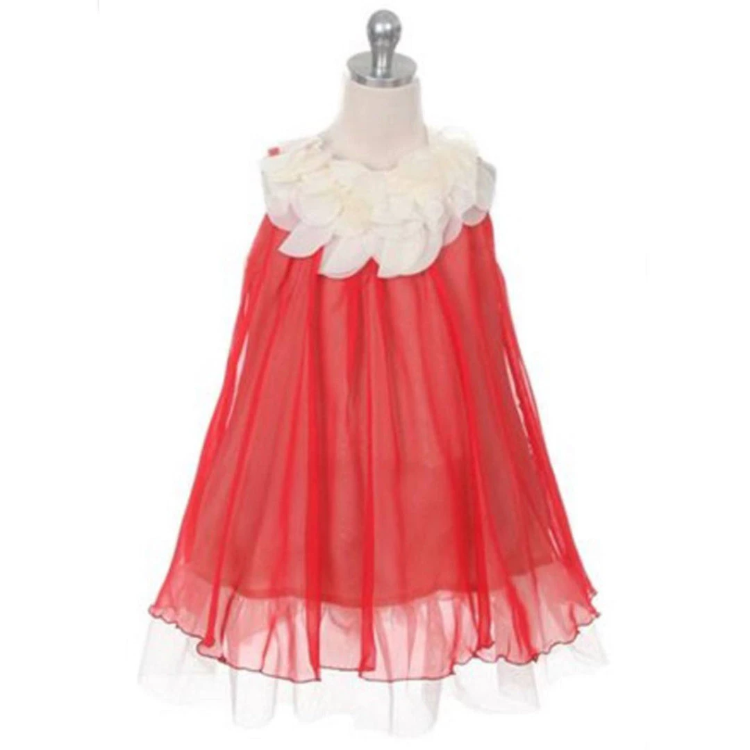 This is one trendy dress for your modern princess. It features a sleeveless chiffon bodice with irremovable ivory flower neckline and an under layer of mesh. The back ribbon tie gives classy look from back and a stylish shape to the dress. The dress is fully lined within to make it look extra elegant. The bunch of ivory flowers on the neckline makes this dress a top choice for your darling’s upcoming special appearance. The under layer of ivory mesh further smarten the trendy look of this tea length attire.