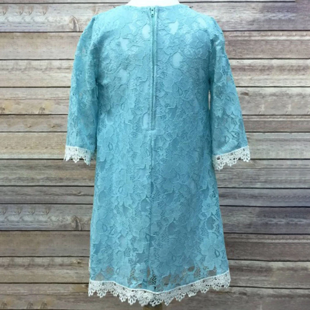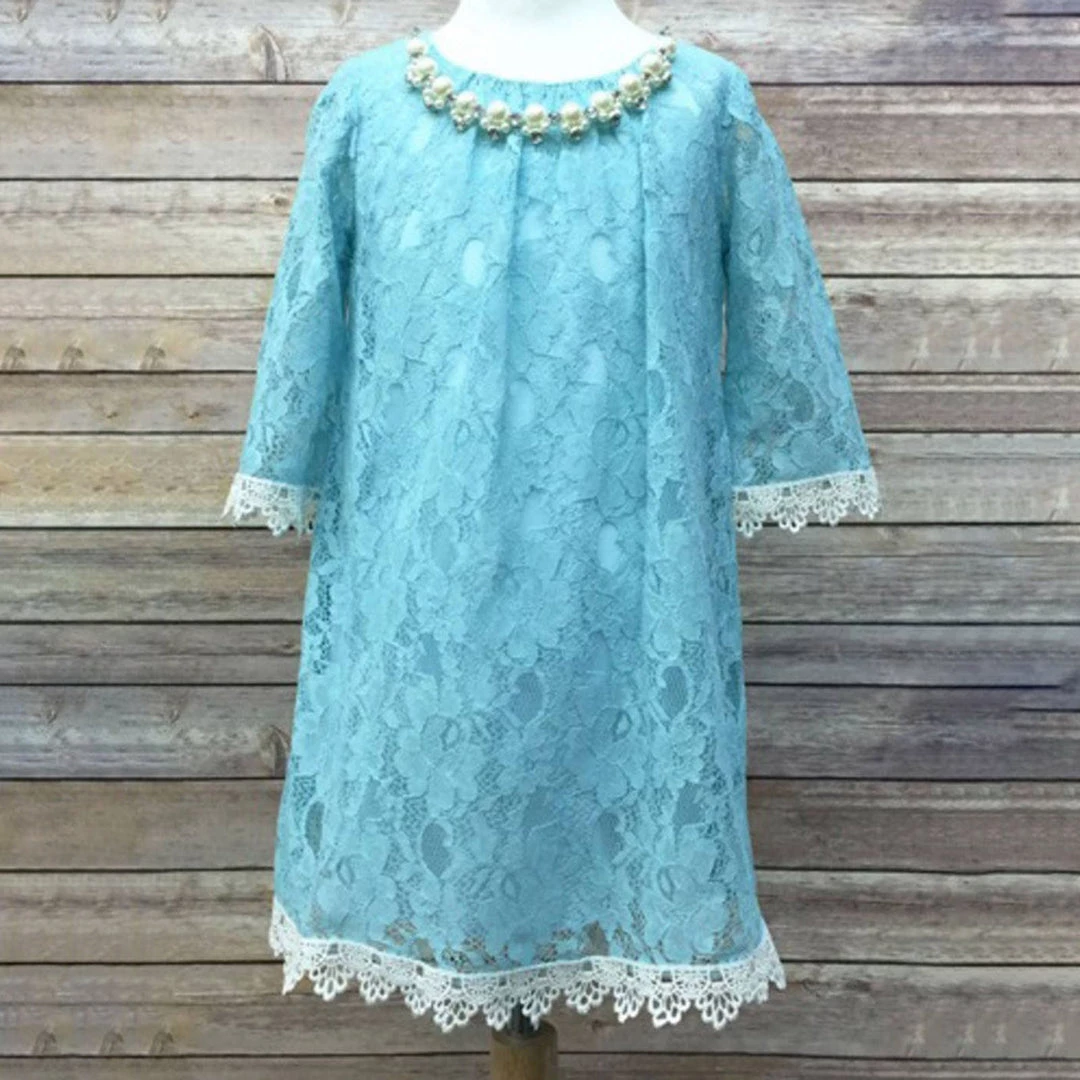 This apparel is absolutely awe-inspiring with enchanting all over floral lace and scalloped lace trimming. This pretty knee length attire features 3/4 quarter length sleeves and is stitched in A-line style. It is fully lined and has a zipper back closure for comfortable wearing. The most chic part of the dress is that it comes with a mesmerizing removable pearl and Rhine stone necklace that has breathtakingly lovely gold accents. This soft and light lace dress is so luxurious to wear and mesmeric to the eyes of the guests and family members that you will surely feel fully tempted to get it for your darling’s upcoming flower girl appearance.