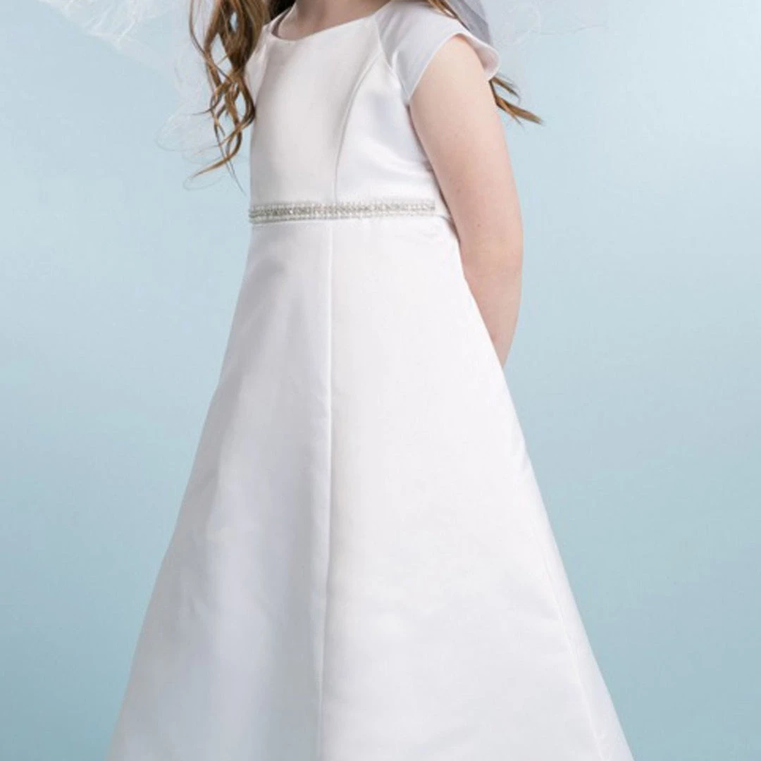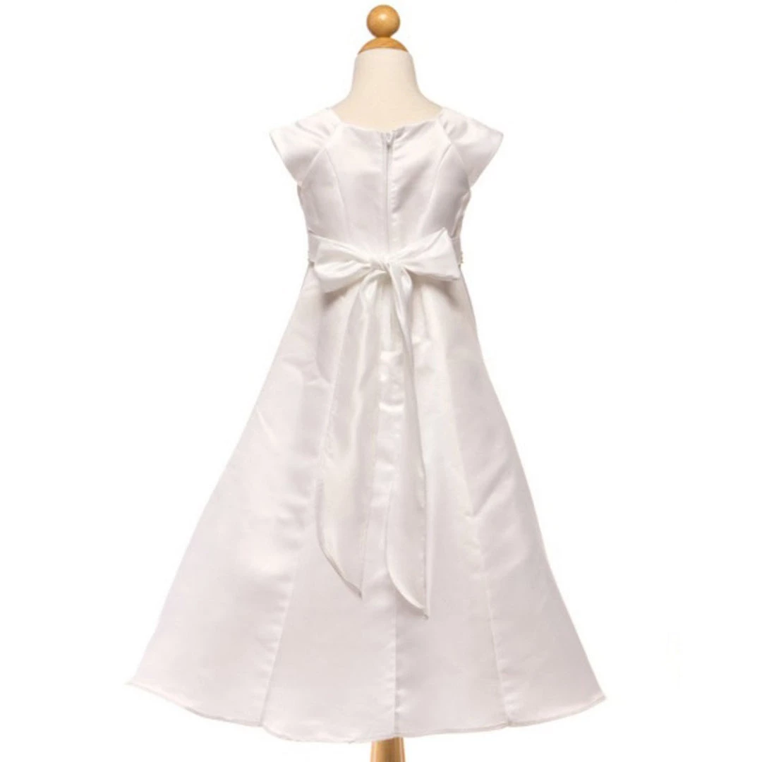 This classic satin dress features cap size sleeve bodice, a glittery rhinestone and pearl trim on the waist belt and very smartly pleated A line skirt. The tie back satin sash and the zipper closure helps in easy wearing and smart shape. The two side pleats in back and front of the dress add elegance and classiness to this stylish dress. This ankle length dress will look breathtakingly inspiring on your little darling with its stylish stitching and sparkly rhinestone trim on the waist.
