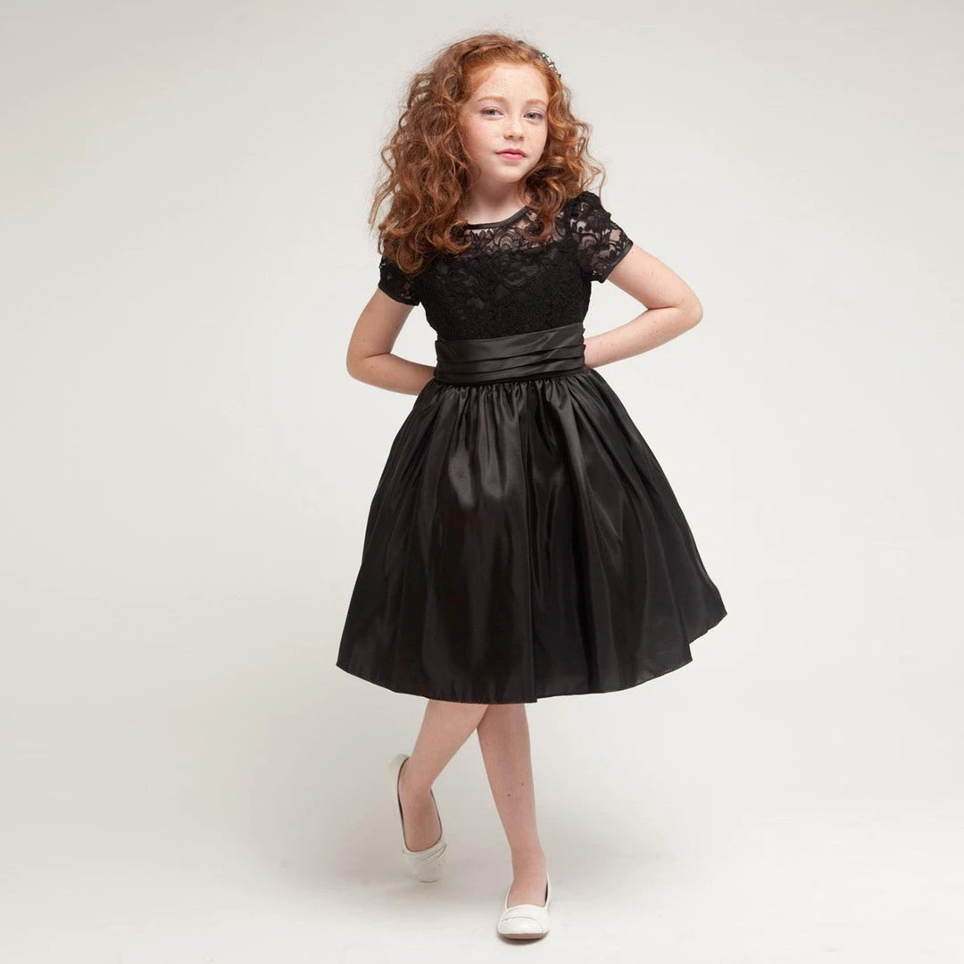 This half sleeve dress has a floral lace bodice with illusion neckline and a pleated taffeta waist sash that ties back to give a perfect fitting. The pleated knee length taffeta skirt shimmers and glistens in light, giving an unimpeachable sheen to your twinkling star. The lace sleeves and the neckline have satin piping that spruces up the elegance of the dress. The crinoline layer and lining within give a voluminous fullness to the skirt that is attributed to the fairies. This special occasion dress is perfect for any formal event like weddings, parties, communions, Easter Celebrations or any other festive ceremony.
