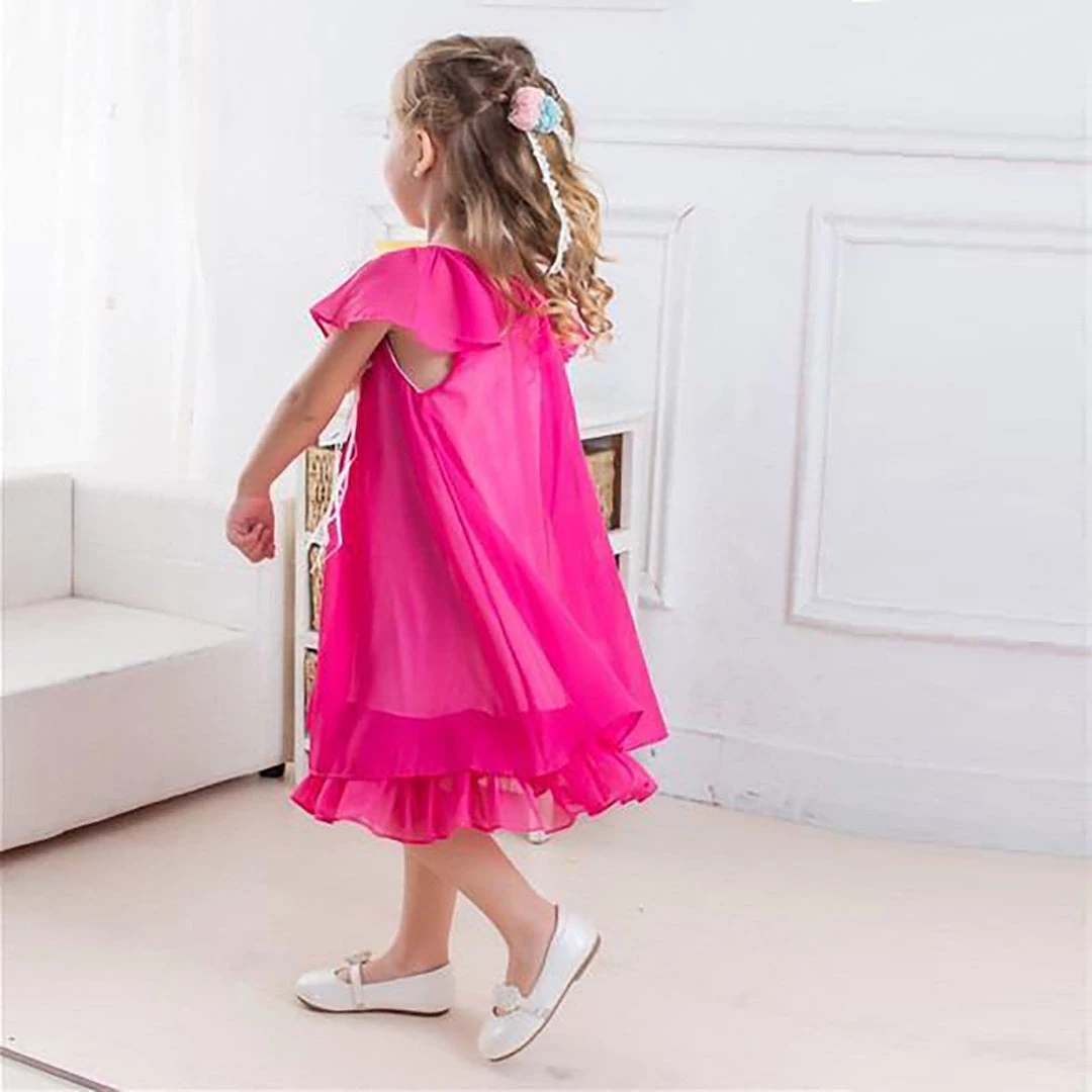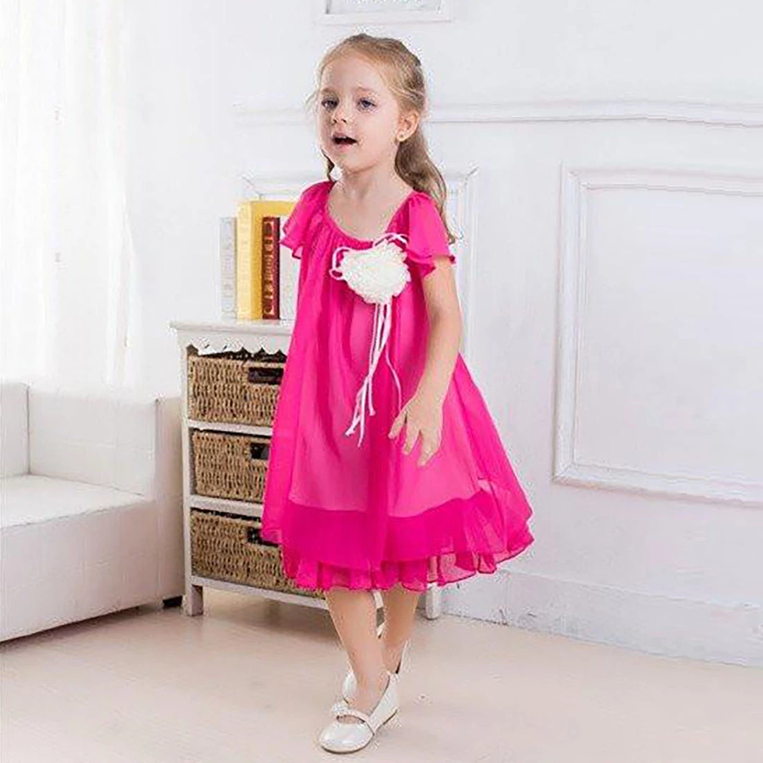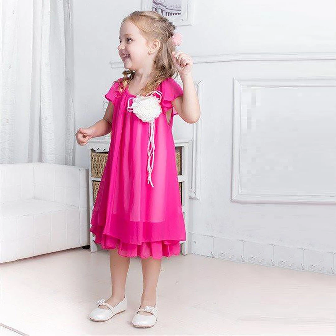 This elegant dress is made of soft, silky and light chiffon and has a gorgeous hand rolled flower under its neckline. This half sleeve dress looks simply adorable with its pleated double layered knee length skirt and a striking flower on the left with silky ribbons dangling loosely. The dress is perfect for summers and outdoor events and ensures super comfort to your delicate princess. The flower on the dress makes it a perfect choice for a flower girl appearance. The trendy styling and pleat details on the sleeves and hemline of the layers are too tempting to ignore