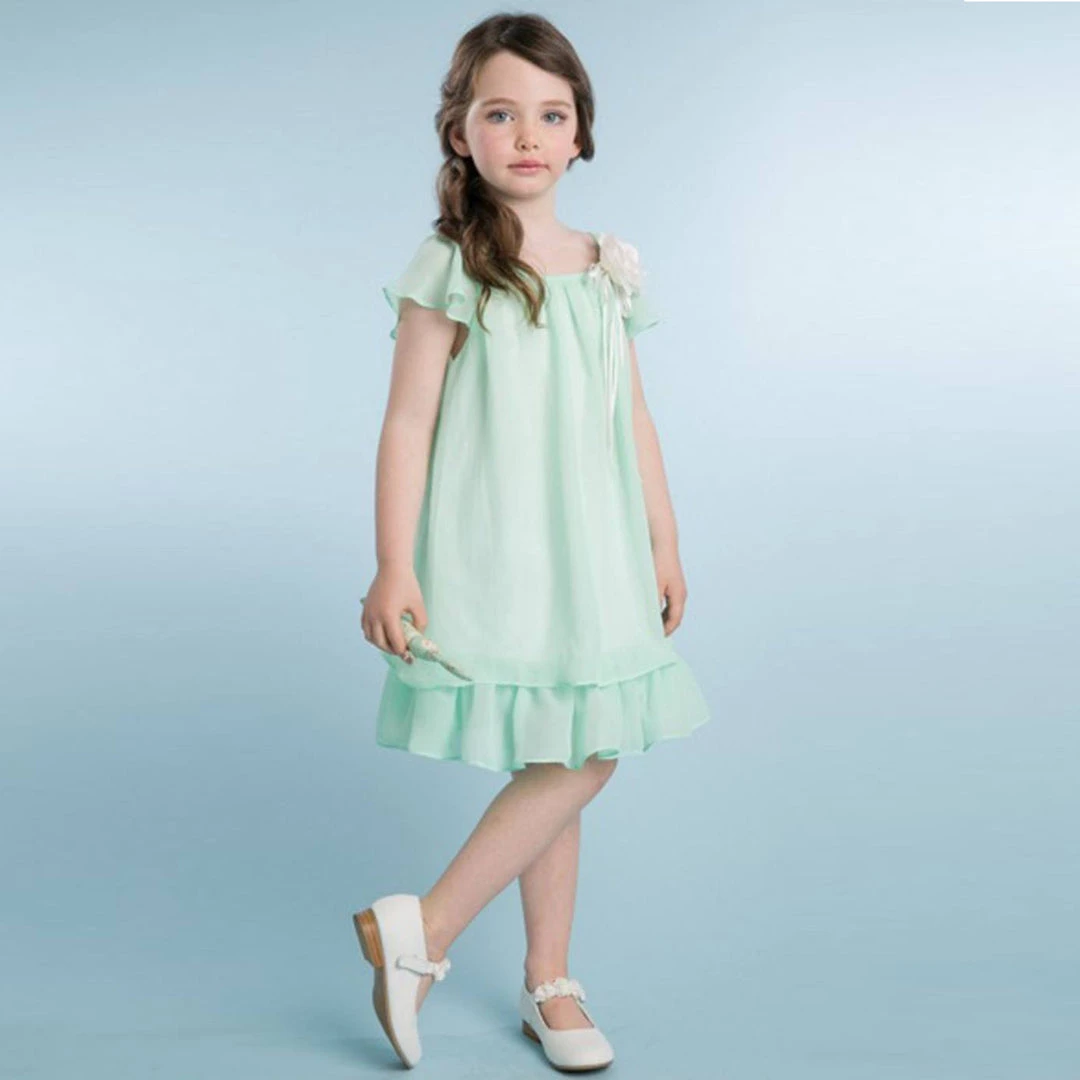 This elegant dress is made of soft, silky and light chiffon and has a gorgeous hand rolled flower under its neckline. This half sleeve dress looks simply adorable with its pleated double layered knee length skirt and a striking flower on the left with silky ribbons dangling loosely. The dress is perfect for summers and outdoor events and ensures super comfort to your delicate princess. The flower on the dress makes it a perfect choice for a flower girl appearance. The trendy styling and pleat details on the sleeves and hemline of the layers are too tempting to ignore