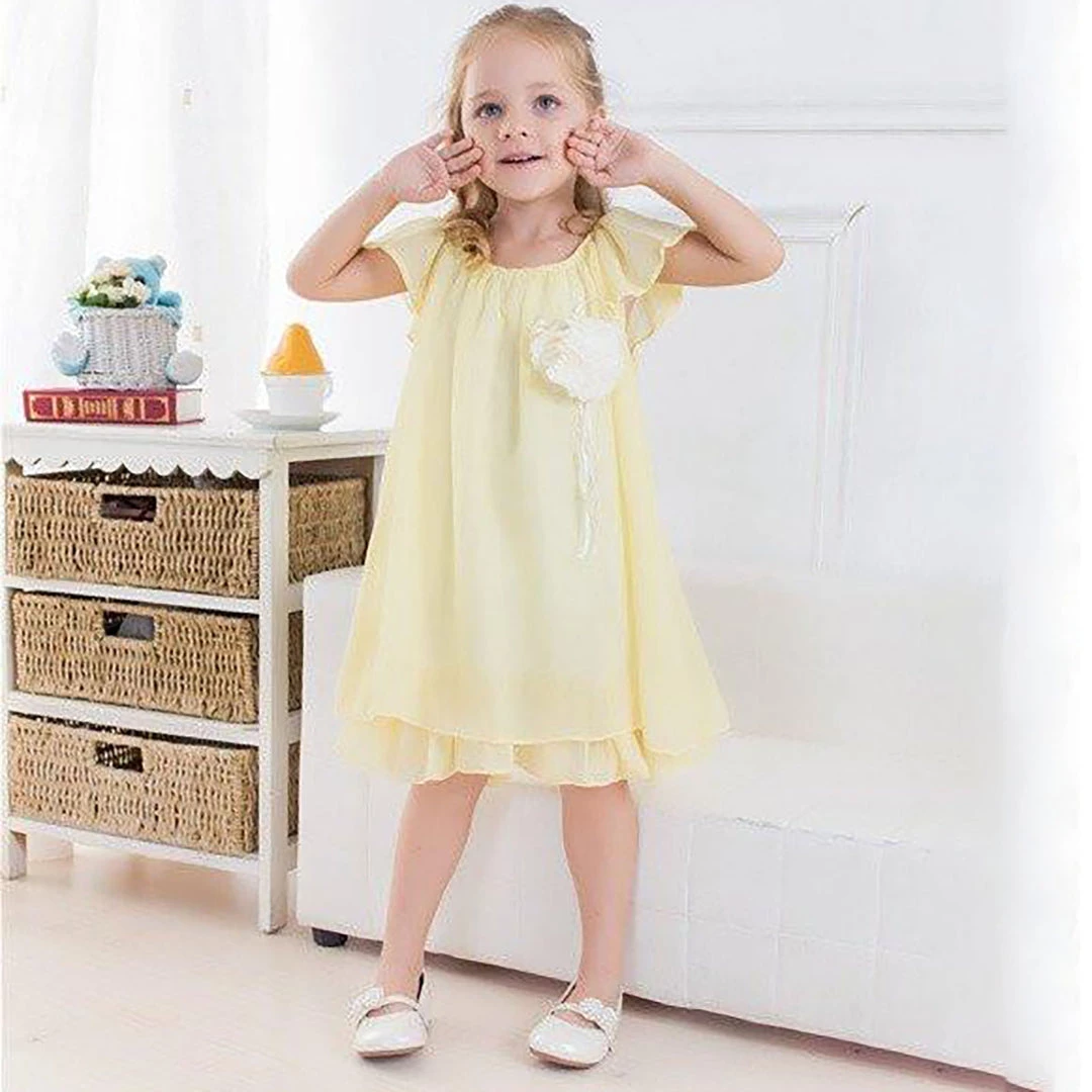 This elegant dress is made of soft, silky and light chiffon and has a gorgeous hand rolled flower under its neckline. This half sleeve dress looks simply adorable with its pleated double layered knee length skirt and a striking flower on the left with silky ribbons dangling loosely. The dress is perfect for summers and outdoor events and ensures super comfort to your delicate princess. The flower on the dress makes it a perfect choice for a flower girl appearance. The trendy styling and pleat details on the sleeves and hemline of the layers are too tempting to ignore