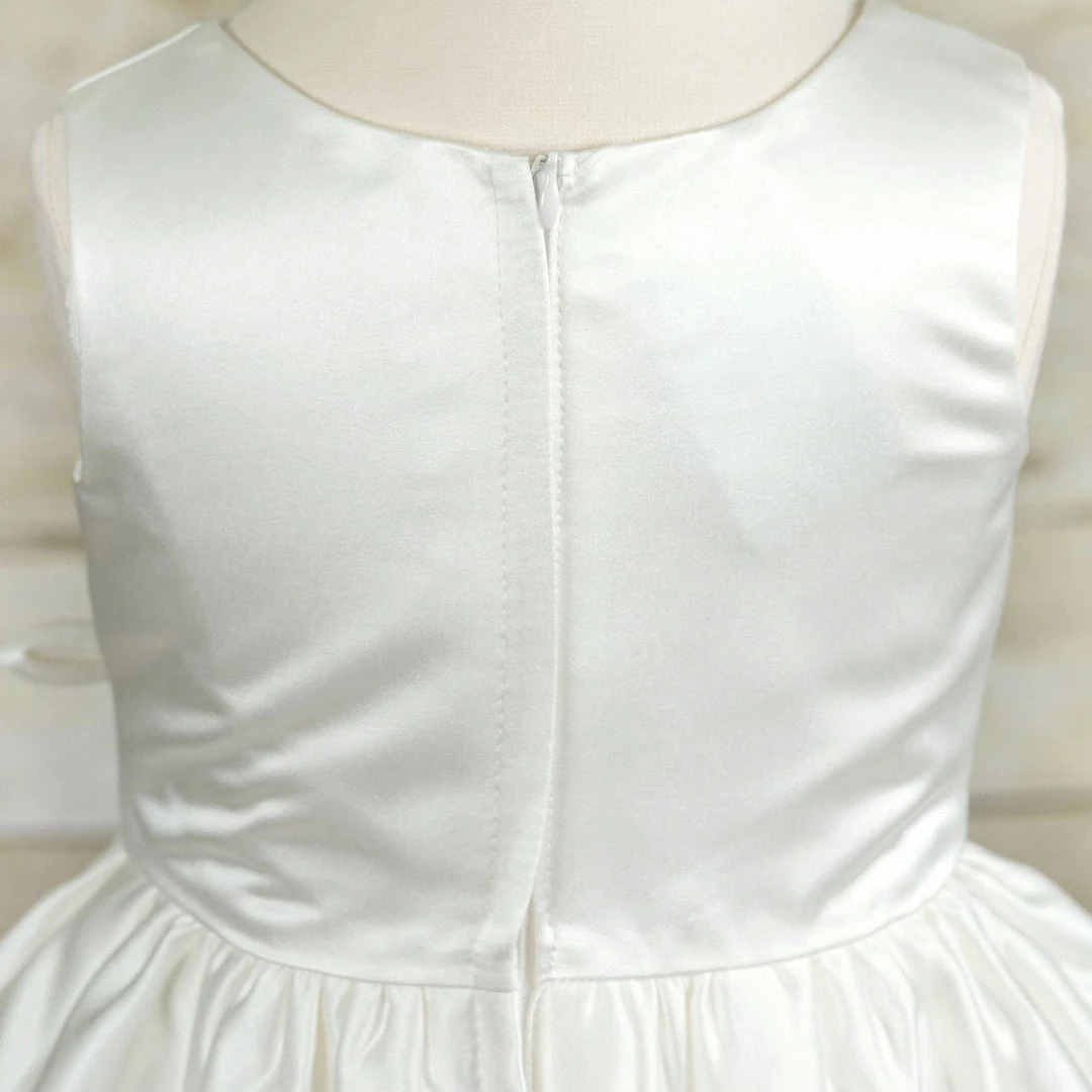 This is just the dress you have been craving for your little princess on her special day. The dress is stitched in adorable bridal taffeta and white net. The sleeveless silk bodice is accented with a cute sash taffeta flower at the waist. This lovely silk flower has amazing details of folds and two long silk ribbons dangling down full length. The double layered tulle skirt has a taffeta silk and additional netting crinoline underneath to give extra fullness. Do no miss out on this dress as this taffeta sleeveless style is simply gorgeous and will surely make your little angel feel like a rose princess she is. This mesmerizing dress can be worn on different events, like; weddings, birthdays, communions, and other celebrations. The style of this white Taffeta flower dress is youthful enough for young girls and sophisticated enough for the older ones.