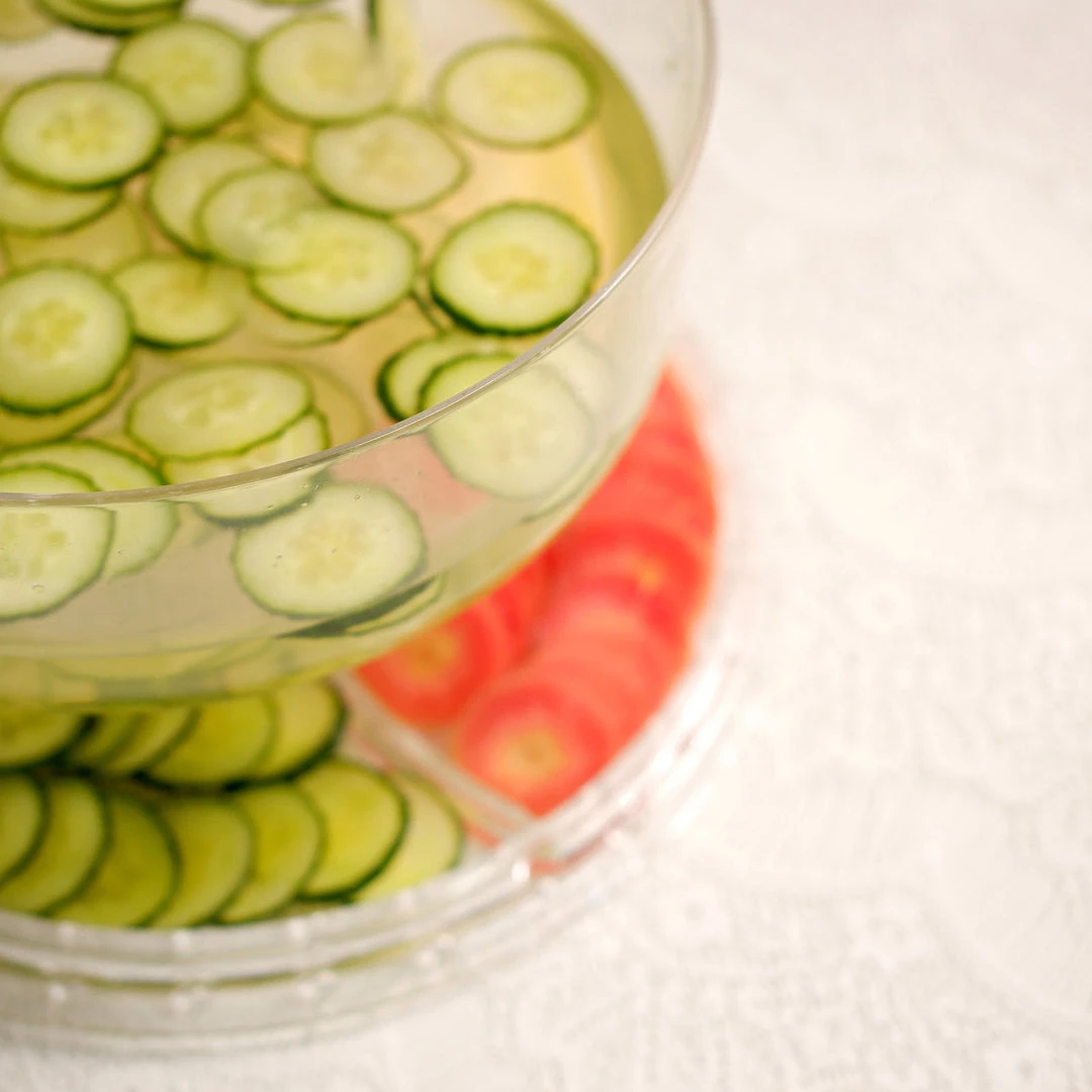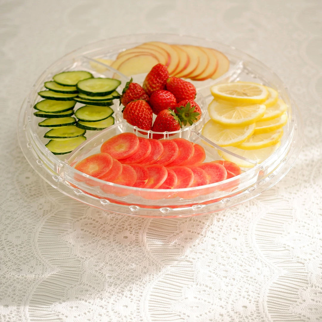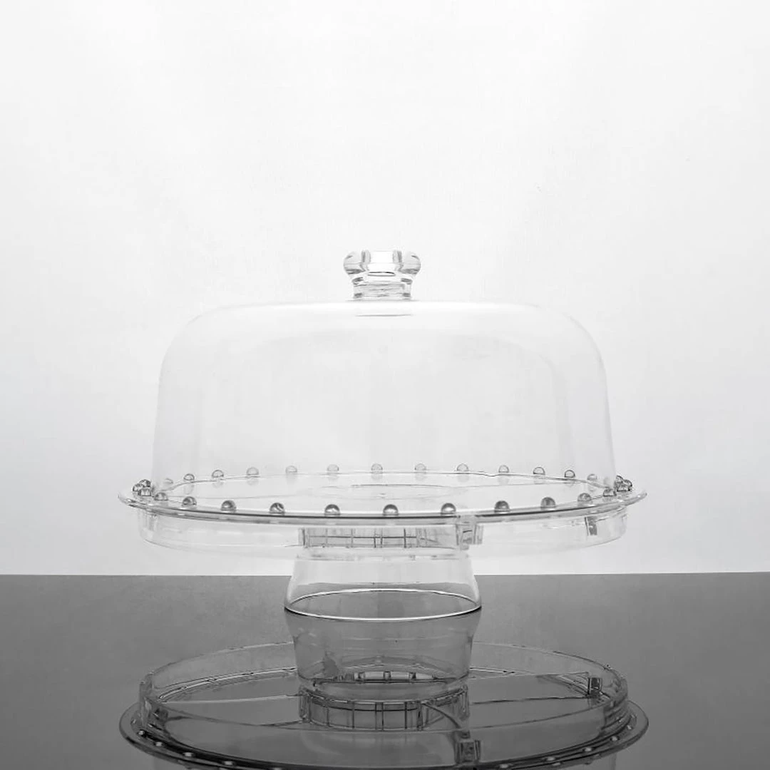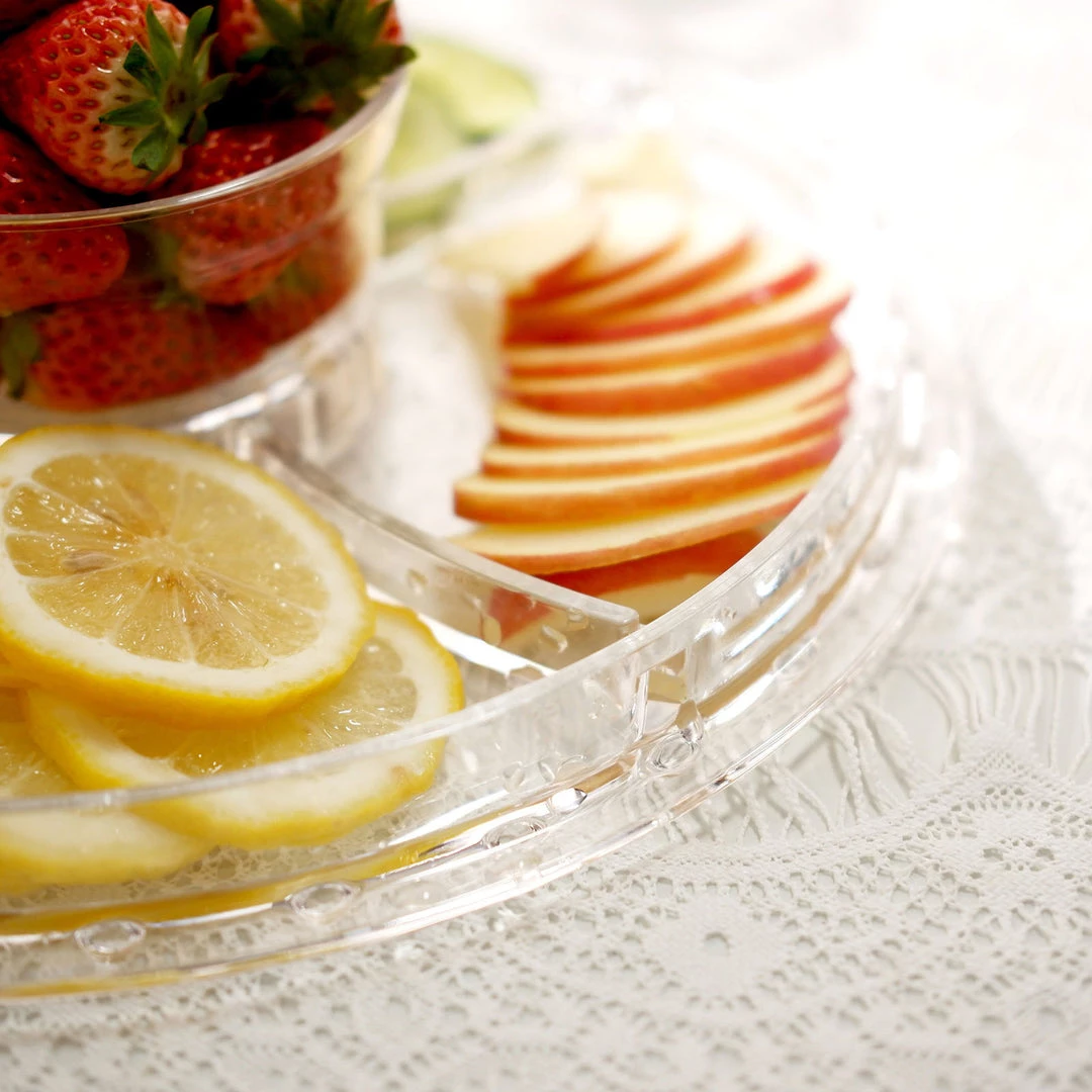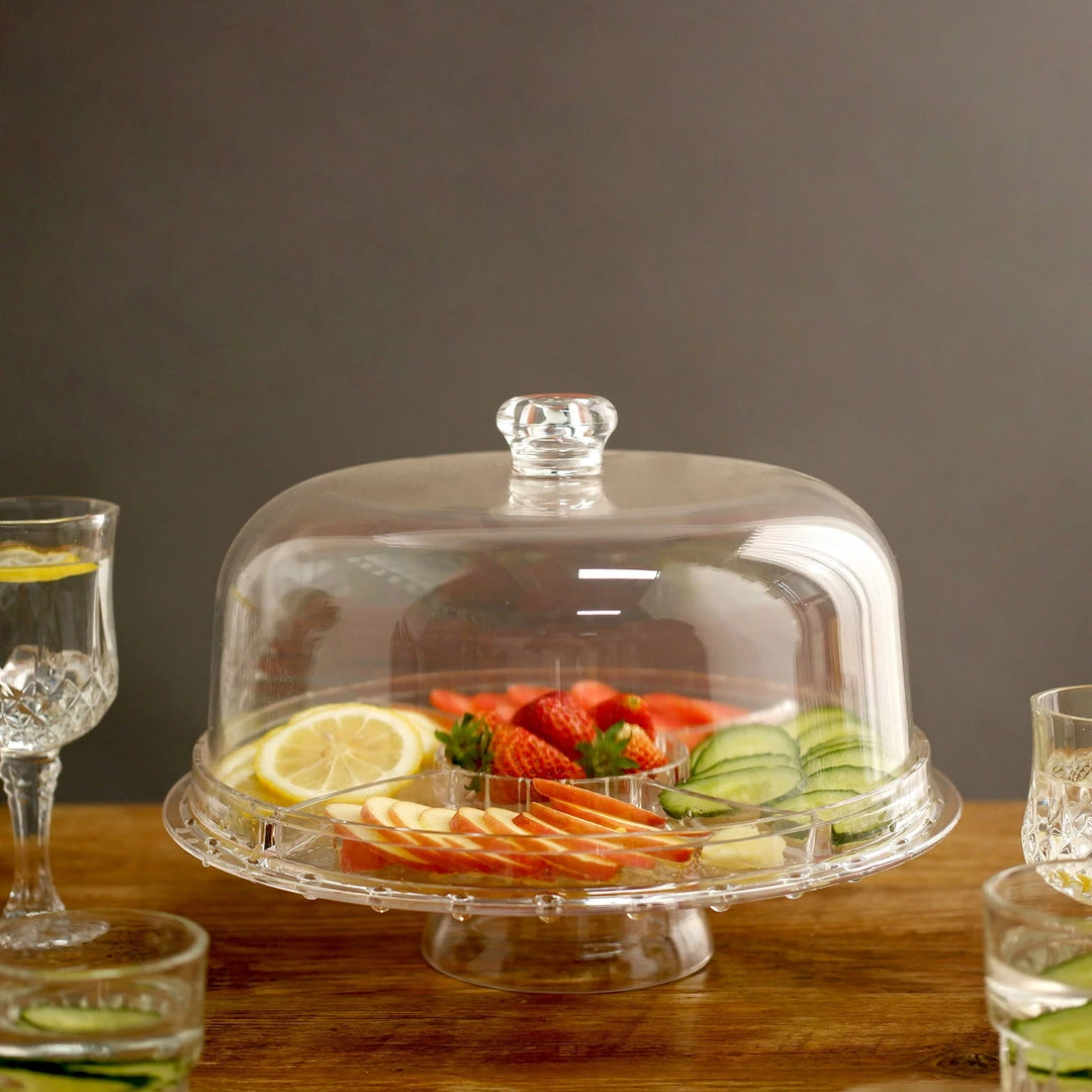 | Cake dome can also function as a punch bowl or cocktail holder, with attached sectional dish used a variety of fruit garnishes or treats. |