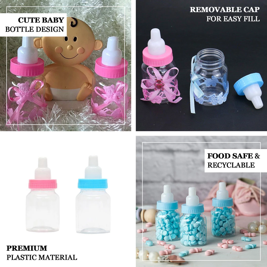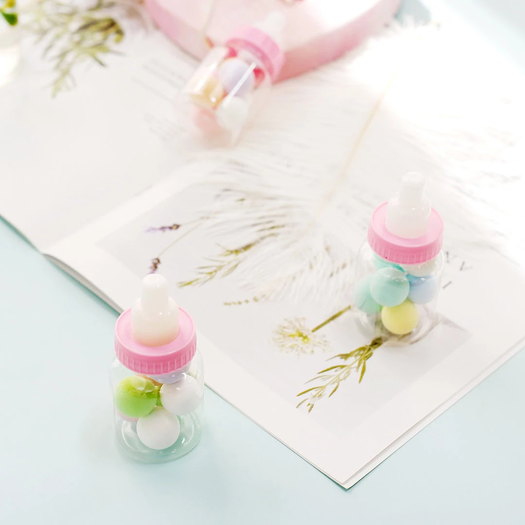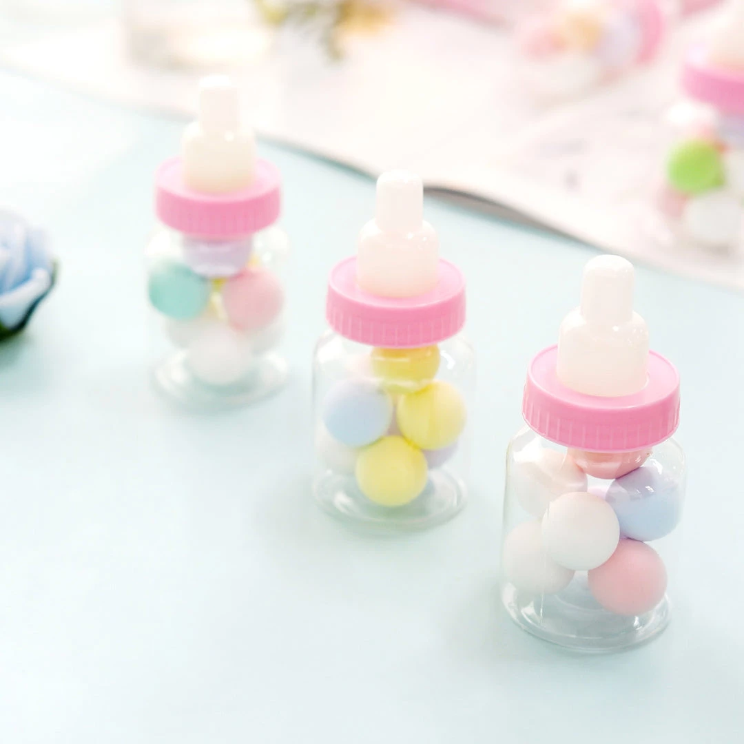 - You can fill the baby bottle containers with candies or incorporate them into a baby shower game. These party favors look so cute they double as decorations