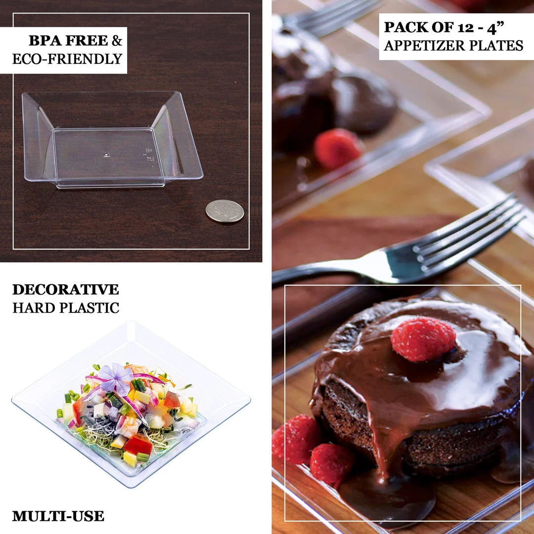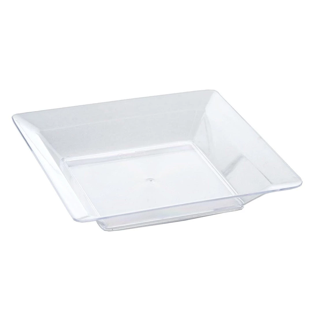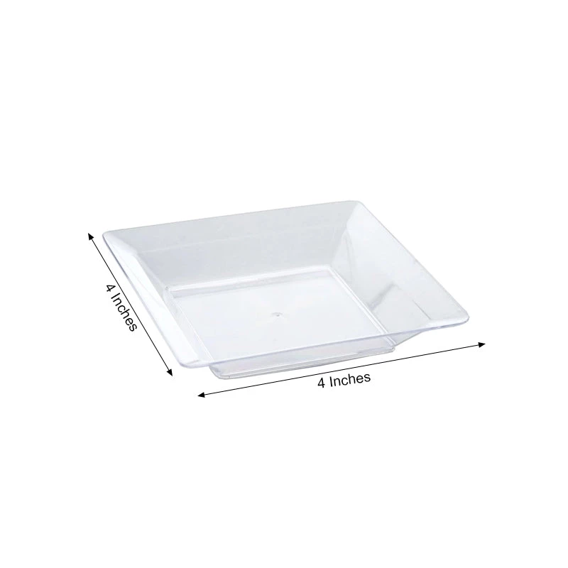 Serve with style using these chic square Mini Plastic Appetizer Plates. Your guests will be deeply inspired by the innovative shape and their glass-like material. Indulge your guests in the sweet ecstasy of merriment and jubilancy by serving succulent desserts and refreshing appetizers in these classy square dessert plates.