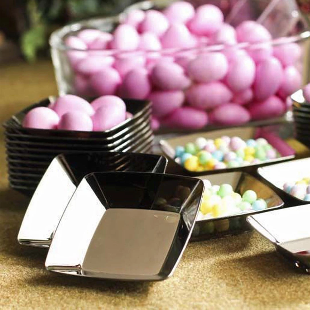 Serve with style with our catchy collection of Disposable Mini Dessert Plates that offer the convenience of disposability with the charm of durable plastic. Transform your conventional dining experience into an elegant affair with these classy minis fashioned in contemporary design and chic shape. Your guests will be startled and awe-struck on the sophisticated presentation of these cute miniature plates. These petite plates can efficiently be used as swish favor holders; simply wrap with ribbons, pearls, or tulle and fill with assorted candies to make an exotic party favor. These contemporary shaped miniature dessert plates will add an elite touch to your tablescape. Sturdy plastic material lets you serve your favorite delights without spilling or leaking. The attribute of disposability makes the cleanup time a breeze for any occasion. Organizing parties and tidying up later on was never this hassle-free!