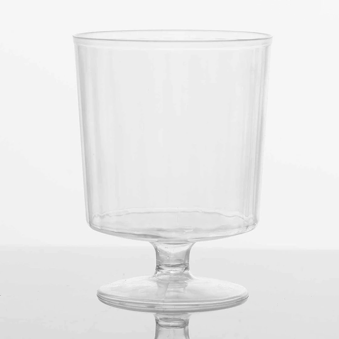 Tablecloths Factory always keeps its customers upscale demands and celebration needs as a priority. Introducing an elegant and innovative design to help you raise a toast of festive joy with pure class and brimming jubilancy. This disposable wine glass is crafted from shiny and clear plastic that mimics the exquisiteness of real glassware. The trendy shape and delicate design makes it an ideal choice for elite parties, culinary events, indoor feasts, outdoor festivals, clubs, bars and restaurants. Serve your favorite beverage, desserts, cocktails, smoothies, Jell-O, or any other delectable delight you want to tempt your guests with. The convenience of disposability avoids the risk of breakage and shattering and also makes the clean-up time a breeze!