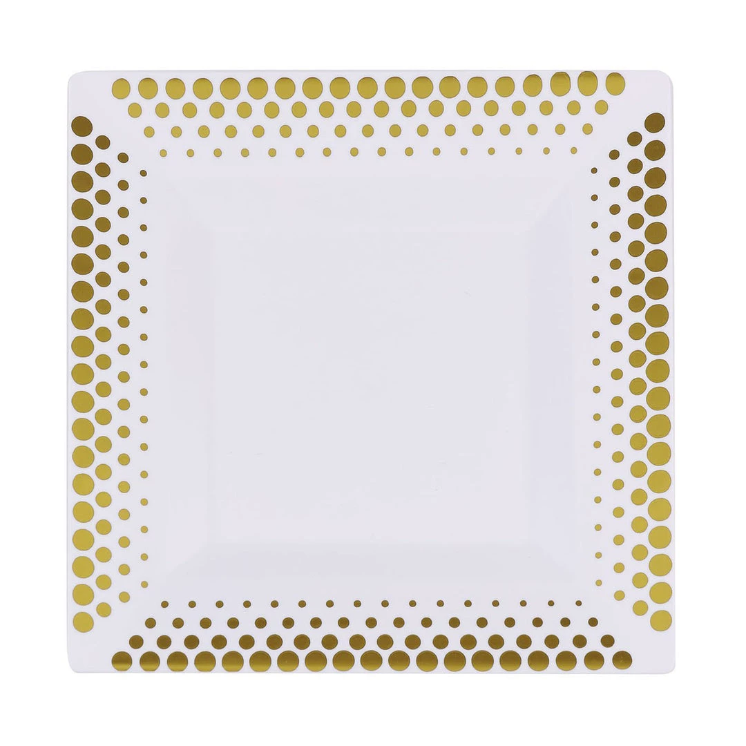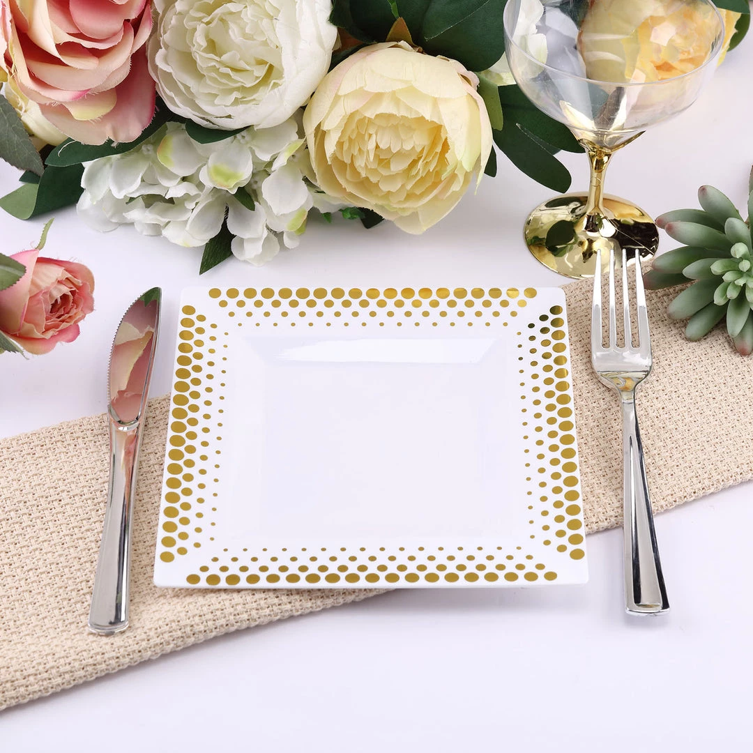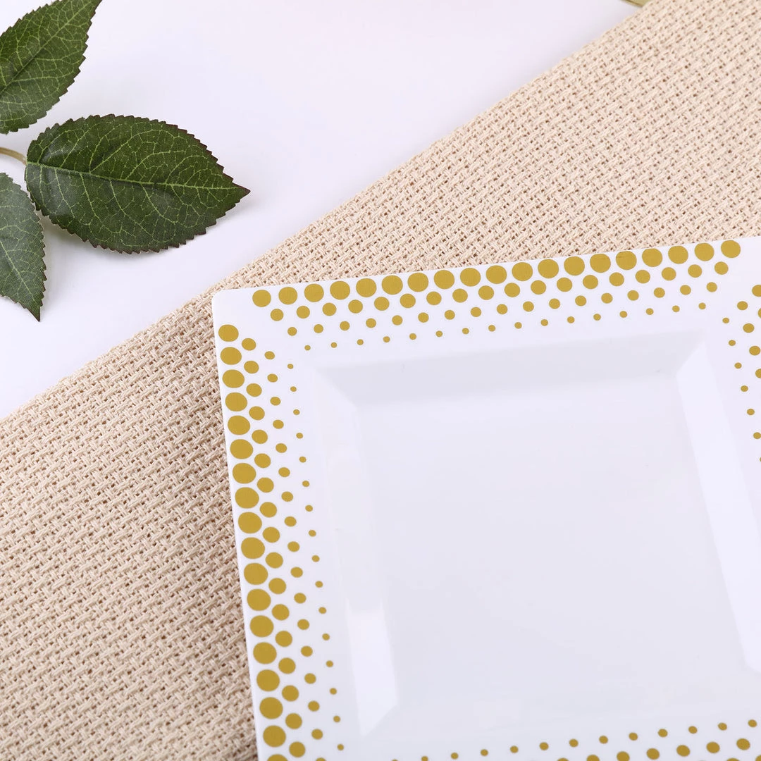 Create an elegant and sophisticated presentation at your upcoming special event or a festive meal with these classy disposable plastic plates. Our astounding collection of Hot Dots design plastic plates combines the convenience of plastic with the charismatic appeal of real china. The swish metallic dots design coupled with chic square shape makes these modern plates appear highly elegant. With glistening metallic dots adorned on the square plates rims, this disposable plastic dinnerware is sure to add a WOW factor to your tablescape. With these beguiling salad plates, make your cleanup time a cinch for any occasion.