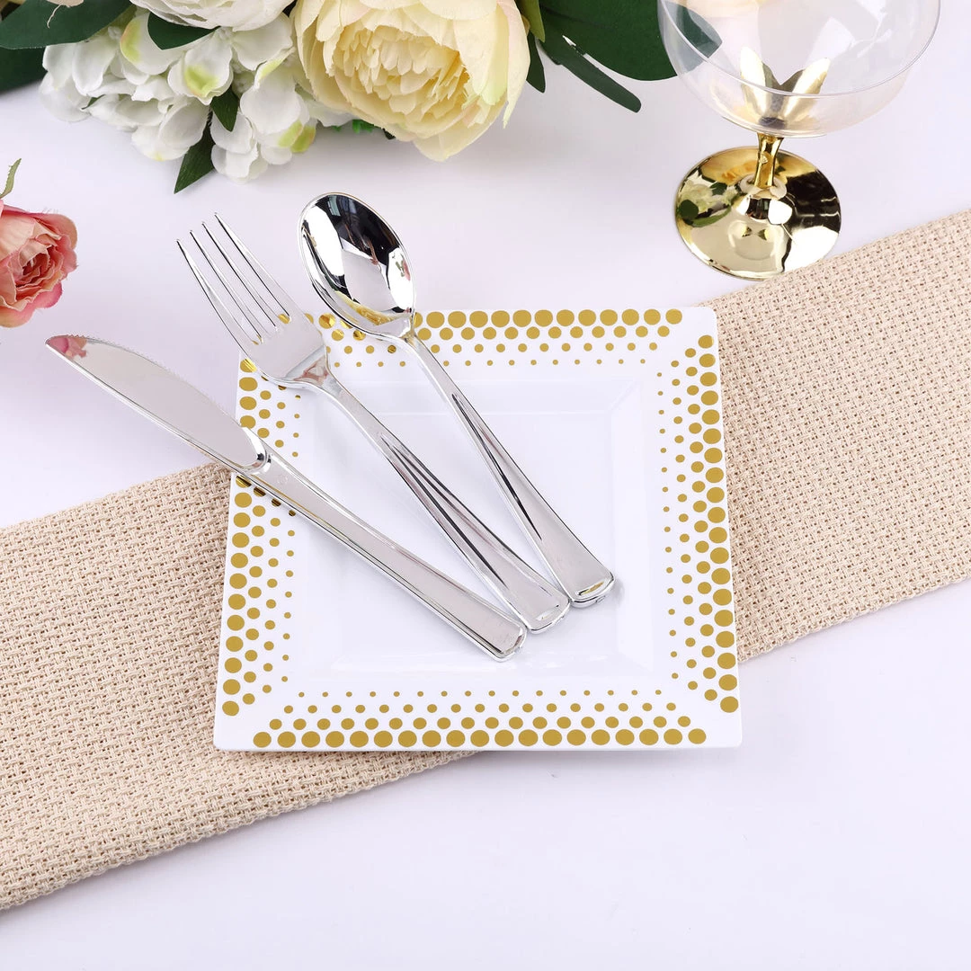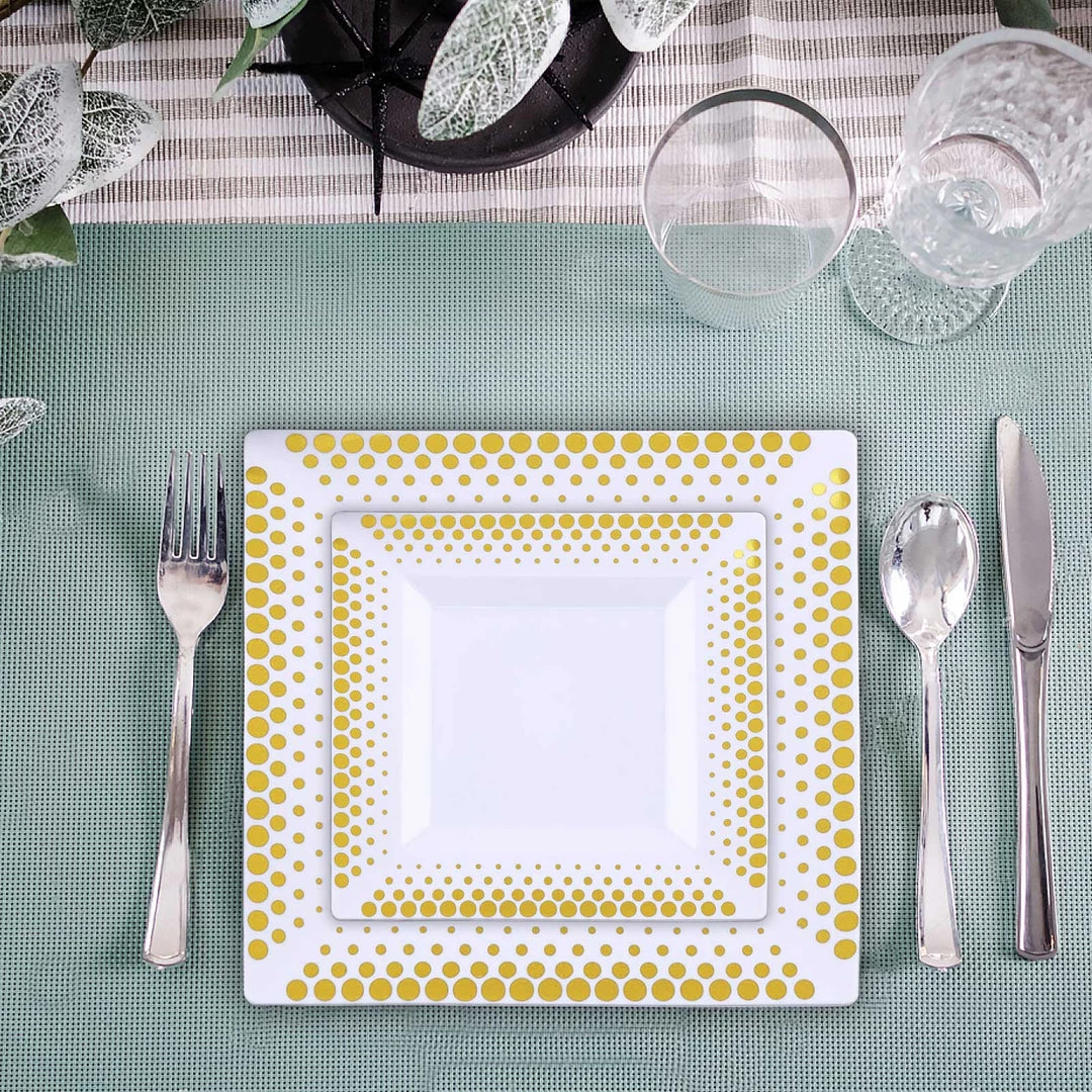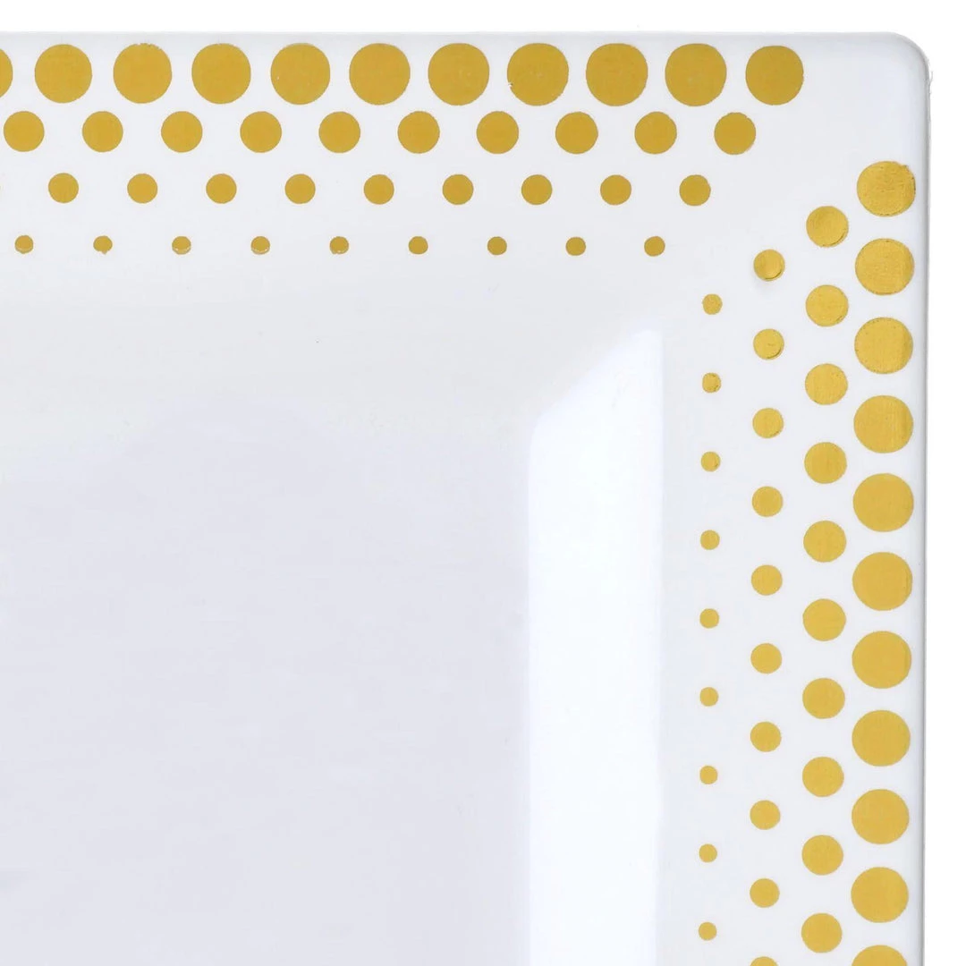 Create an elegant and sophisticated presentation at your upcoming special event or a festive meal with these classy disposable plastic plates. Our astounding collection of Hot Dots design plastic plates combines the convenience of plastic with the charismatic appeal of real china. The swish metallic dots design coupled with chic square shape makes these modern plates appear highly elegant. With glistening metallic dots adorned on the square plates rims, this disposable plastic dinnerware is sure to add a WOW factor to your tablescape. With these beguiling salad plates, make your cleanup time a cinch for any occasion.