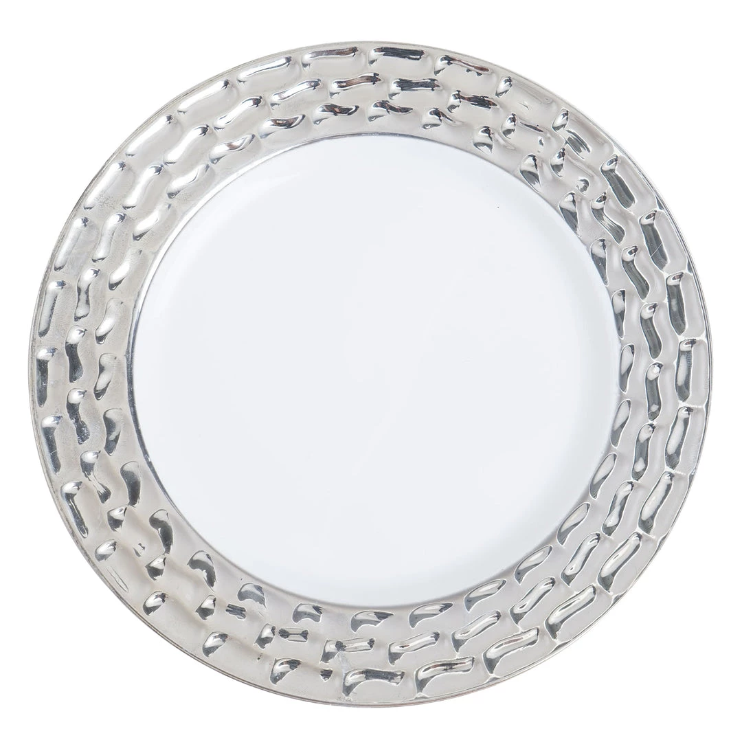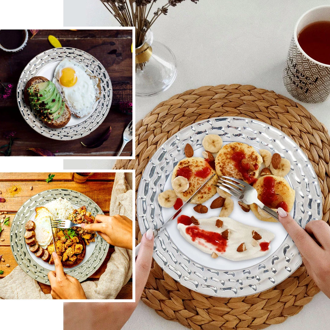 Our shiny silver plastic Disposable Appetizer Plates are so sparkling that they will exhibit your desserts, appetizers, and other delights in a surreal style, enhancing their scrumptiousness manifold. Create a truly regal tablescape by pairing this dazzling darling with our silver-theme Cutlery, Stemware, Silverware, and Dishware and place atop white cotton linen for a crisp contrast, or create a glamorous coherent ambiance by complementing these posh plates with our silver tone table runners, table linens, tablecloths, table napkins and napkin rings.