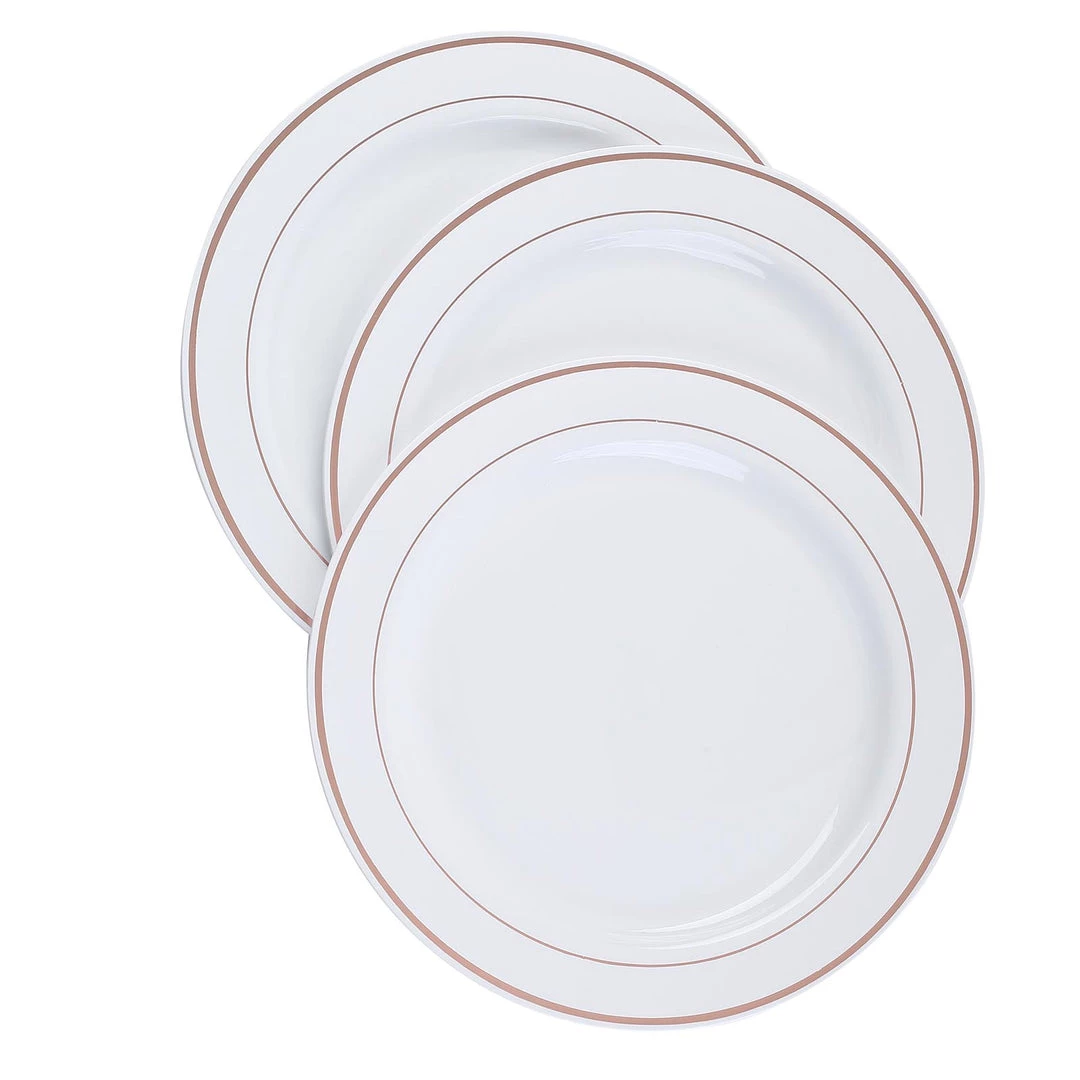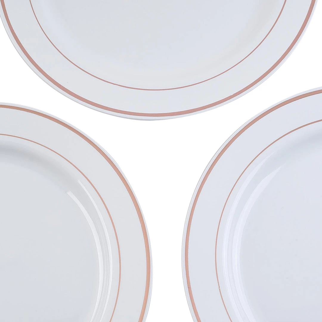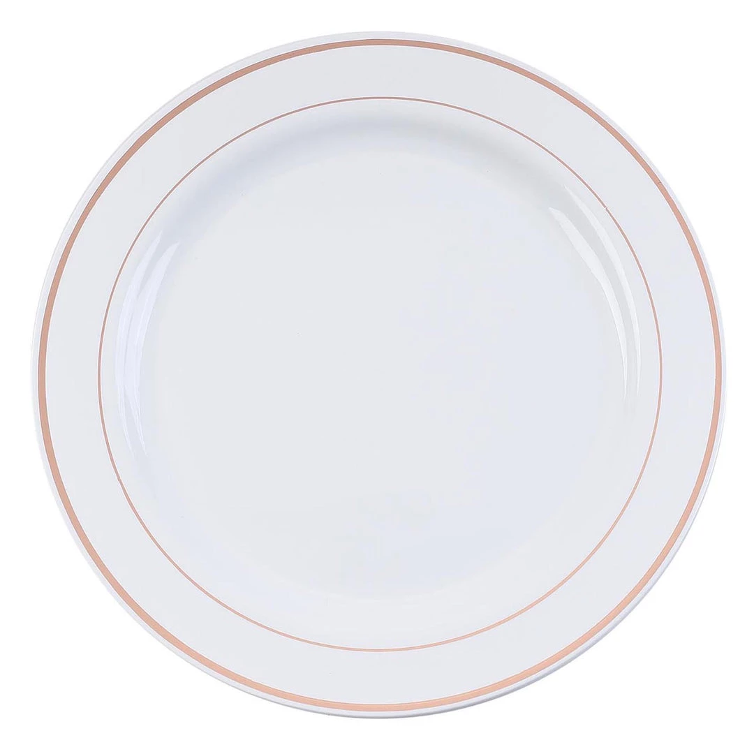 - Style: White Round Plate with Outer + Inner Rose Gold Foil Rims