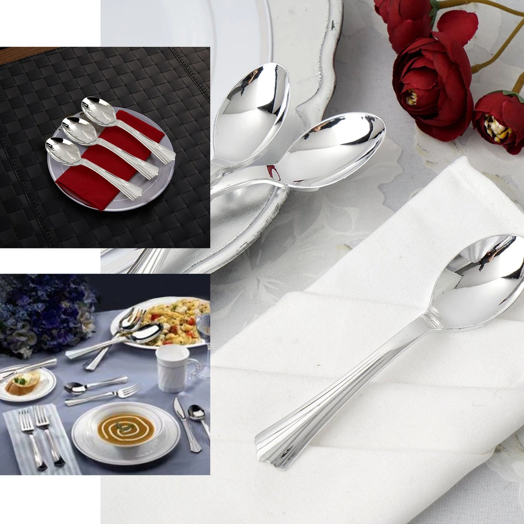 Create an elegant and sophisticated presentation at your upcoming special event or a festive meal with these classy disposable plastic tea spoons. The highly reflective, metallic look and a decorative handle coupled with fine silver finish makes these modern spoons appear highly elegant. Whether its a jubilant birthday party or a festive wedding reception; these spoons are an ideal choice for tea, coffee, salads, cakes, cereals, side dishes, fruits, desserts, appetizers, and more. These disposable plastic tea spoons are strong and sturdy, thus will avoid any leaking or spilling of food while eating. During exciting indoor events and summer fun activities, make dining and tidying a breeze with our special disposable plastic spoons.
